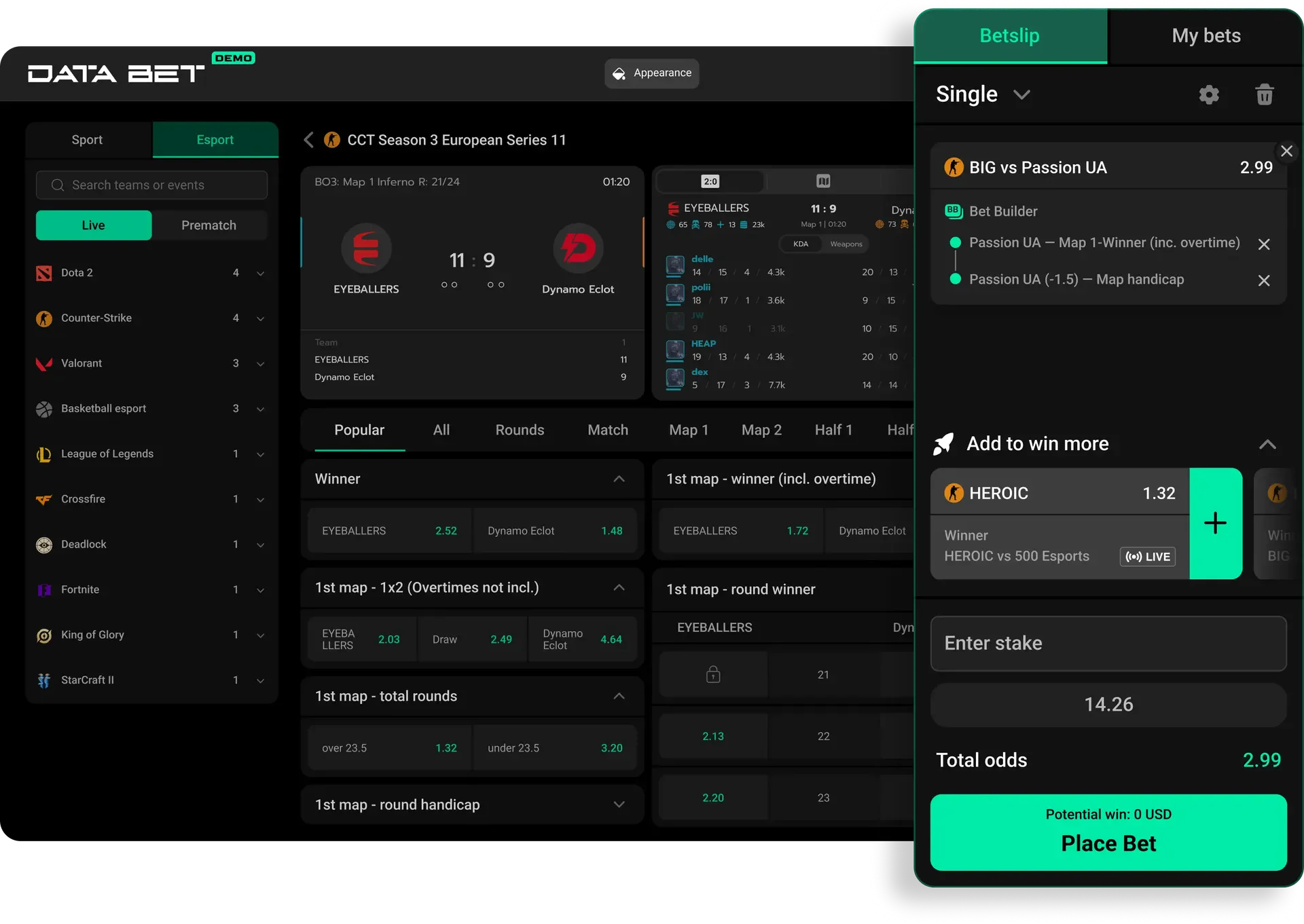 Users can create custom bets by combining multiple outcomes within a single match. Designed for experienced bettors, it offers more control and flexibility, perfect for dynamic titles like CS2, Valorant, Dota 2, and League of Legends.
