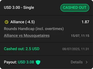 Early Payout allows players to secure a win before the final whistle when key conditions are met without waiting for the final result. It transforms tense moments into instant wins and keeps players active throughout the match.