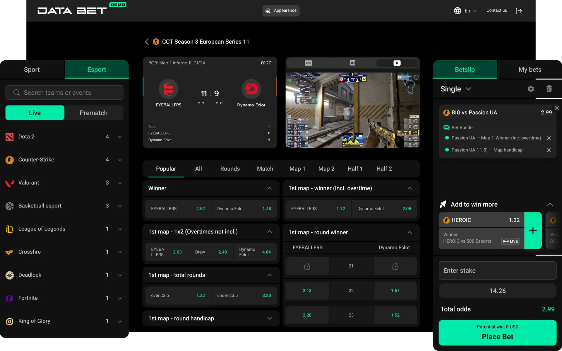 The Single Page Application (iFrame) embeds directly into your website and is customized to match your visual style. It provides a seamless, native experience with the full portfolio of sports and key betting features in one interface