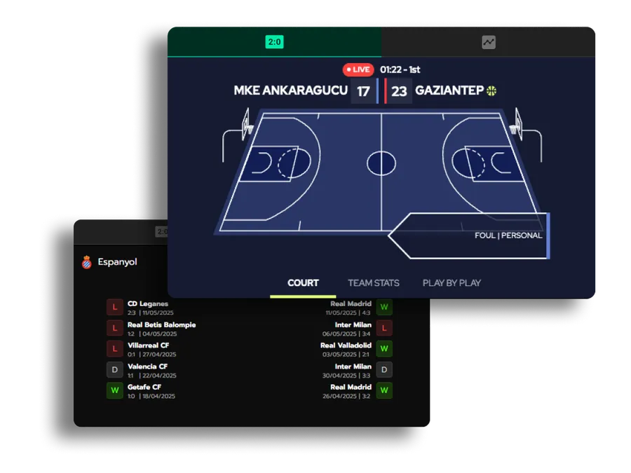 Flexible and customizable solutions designed around partner needs — including extensive live and pre-match coverage, integrated streaming, and interactive widgets for football, American football, tennis, and basketball.